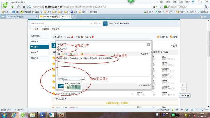 論壇右上角的紅圈內是注冊和登錄窗口,注冊比較簡單,自己隨便起個名字,設個密碼就可以注冊,注冊后可以在所有欄目發(fā)帖。如果你不想注冊,可以點擊下部紅圈內的“保安家園”里邊的“保安故事”或者“保安技巧”,進入后可匿名發(fā)帖: