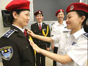 看到2006式保安服非常搶眼,紅色蓓蕾帽、紅色領(lǐng)帶、白色襯衣、咖啡色服裝、閃亮的帽徽、肩章……與以往的以深灰色為主的保安服和大沿帽相比看起來更精神。
