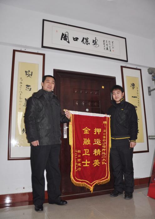 2012年1月16日,中國(guó)建設(shè)銀行周口市支行保衛(wèi)部經(jīng)理吳洪山、運(yùn)營(yíng)部經(jīng)理王一民拿著一面繡有“金融衛(wèi)士,押運(yùn)精英”的錦旗,來(lái)到周口市保安服務(wù)公司押運(yùn)二大隊(duì),把錦旗親手交到公司押運(yùn)副經(jīng)理、押運(yùn)二大隊(duì)大隊(duì)長(zhǎng)郭偉手中,感謝保安公司押運(yùn)大隊(duì)一年來(lái)對(duì)建行守押工作的大力支持。