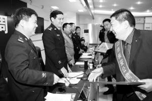 市保安公司總經(jīng)理韓國(guó)華(左一)為先進(jìn)工作人員頒發(fā)獎(jiǎng)匾。為鼓勵(lì)先進(jìn),鞭策后進(jìn),激勵(lì)廣大保安隊(duì)員工作積極性,近日,市保安公司召開(kāi)2011年度工作總結(jié)表彰大會(huì),公司機(jī)關(guān)全體工作人員和各縣(市)分公司及公司押運(yùn)、技防、人防人員200余人參加了表彰大會(huì)。(記者 陳永團(tuán) 通訊員 王俊超  攝)